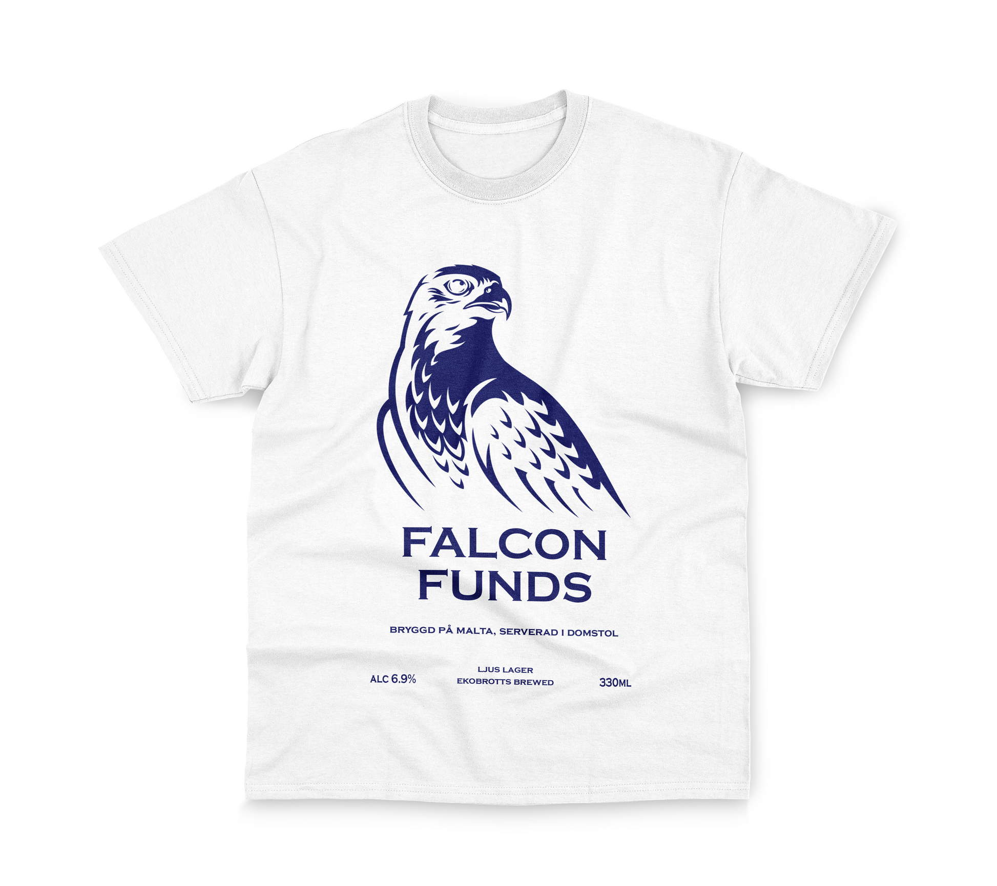 Den här tishan är inte bara ett plagg – det är en fondstruktur i textilform. Med en örn på bröstet och texten “Bryggd på Malta. Serverad i domstol” hyllar den ett av Sveriges mest skamlösa kapitel i finanshistoria.